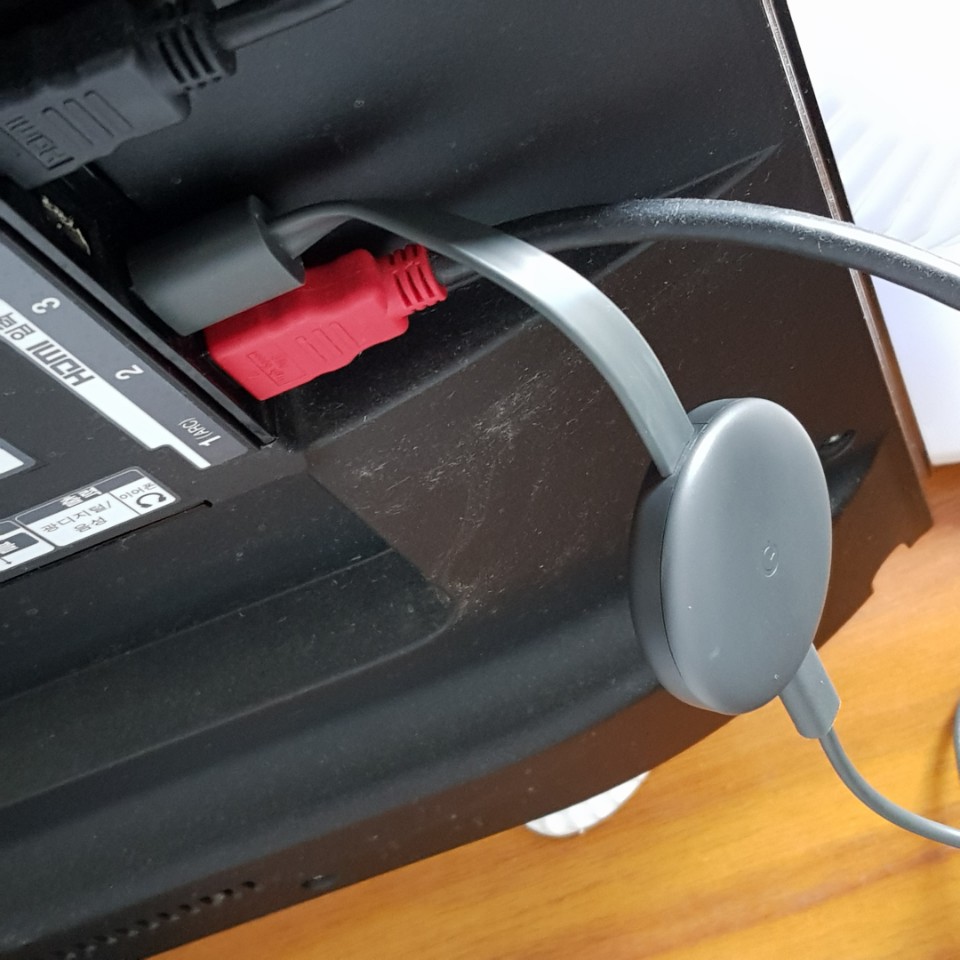 티비 뒷면에 HDMI에 구글 크롬 케스트를 연결시켜주고 전원 어댑터를 콘센트에 연결해 줍니다.