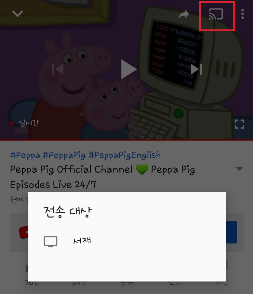 요렇게 유튜브를 열면 오른쪽 상단에 전송 버튼이 생기고 여기를 누르면